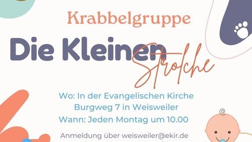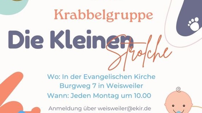 "Die kleinen Strolche" werden sich jede Woche montags um 10:00 Uhr im Gemeindezentrum in Weisweiler treffen. Wir haben noch einige freie Plätze und freuen uns über Anmeldungen im Ev. Gemeindebüro in Weisweiler.